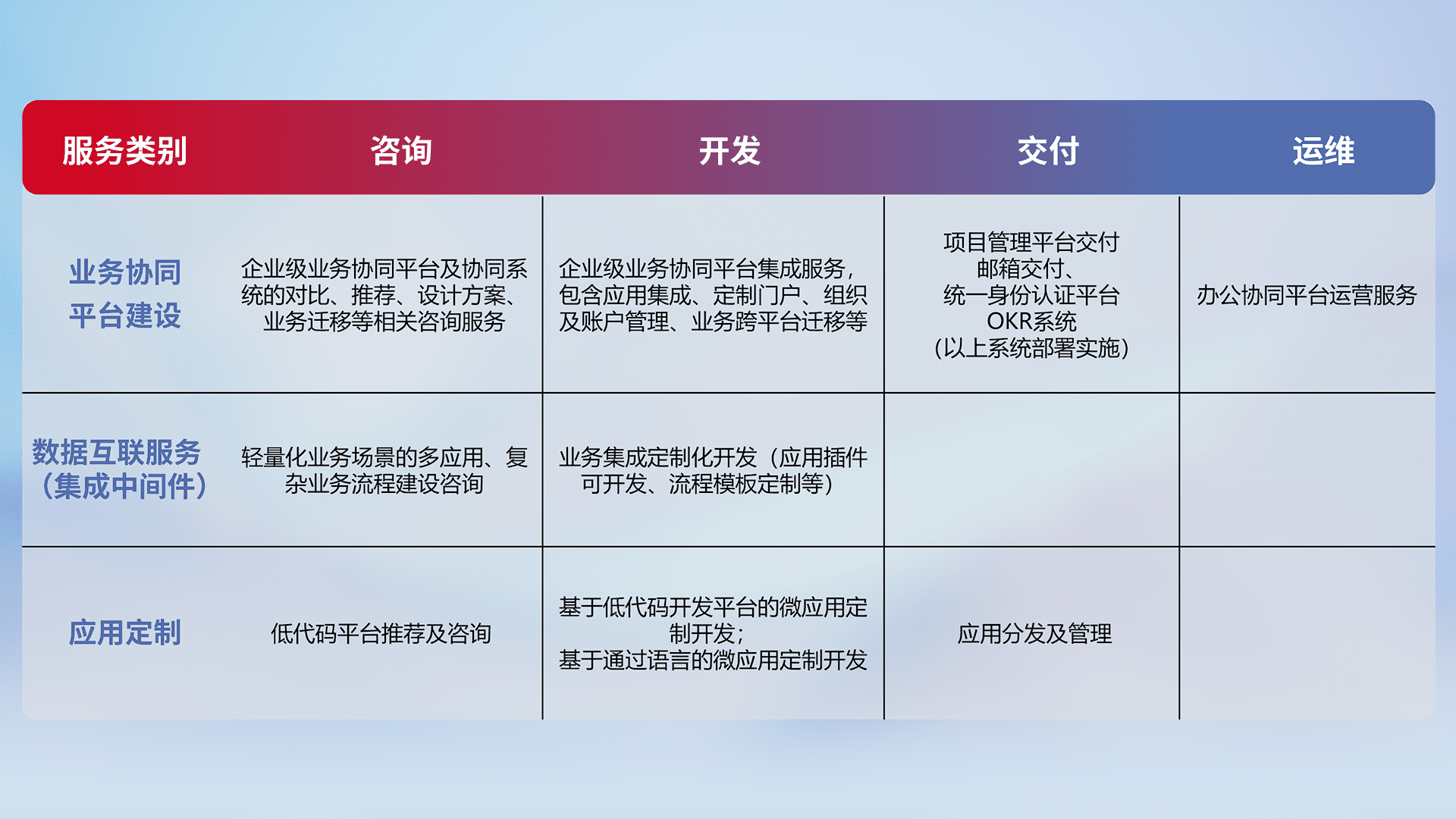 针对钉钉、、企微、、IDaas等平台级产品提供产品的规划、、、、方案、、、交付、、、、定制化开发等服务,,,,实现如统一协同办公、、、、智能客户服务、、、、混合会议管理、、、、智能数据查询、、、、等业务场景,,,,实现数字化转型。。